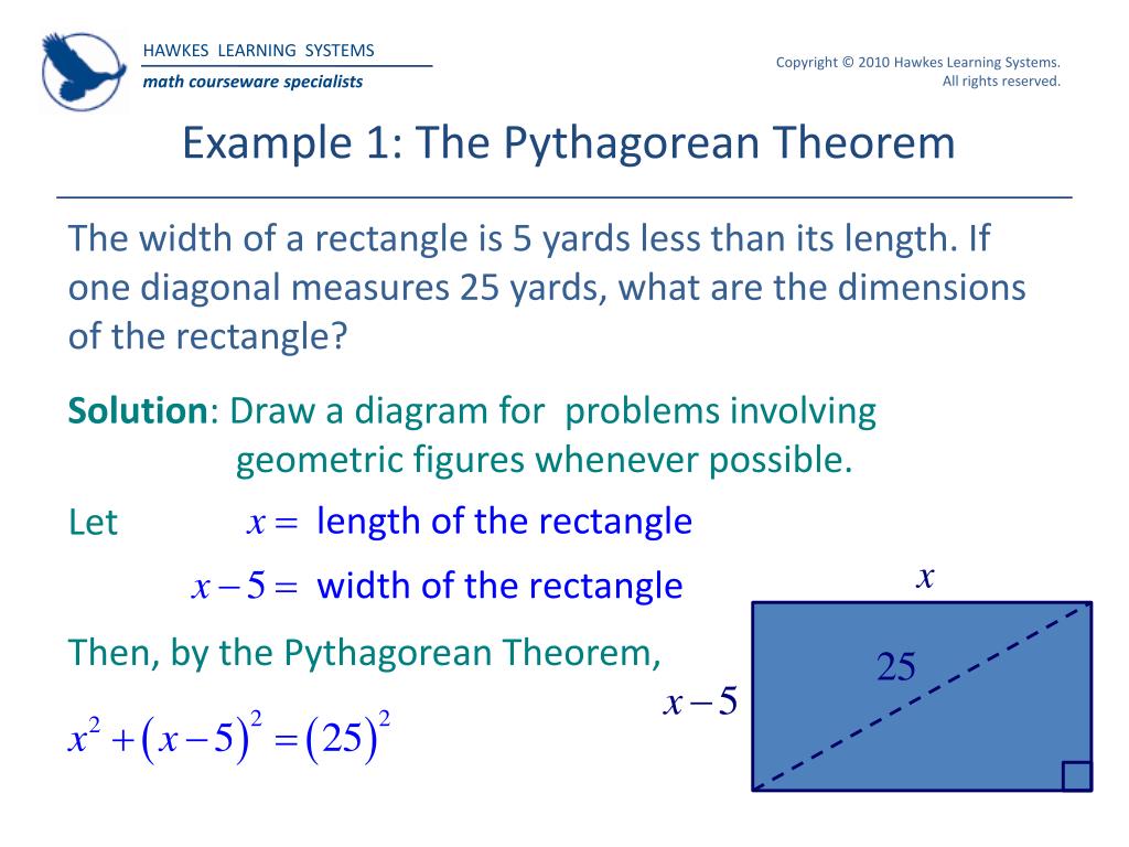 Example 1: The Pythagorean Theorem The width of a rectangle is 5 yards less than its length. If one diagonal measures 25 yards, what are the dimensions of the rectangle? Solution: Draw a diagram for problems involving geometric figures whenever possible. Let Then, by the Pythagorean Theorem,