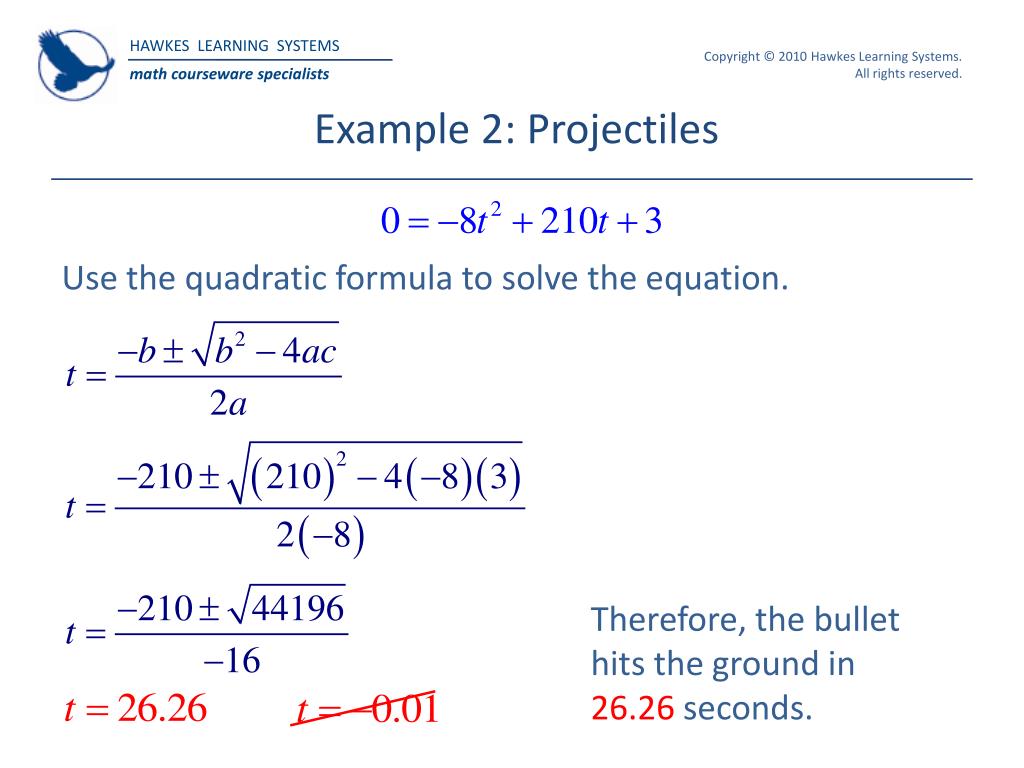 Example 2: Projectiles Use the quadratic formula to solve the equation. Therefore, the bullet hits the ground in 26.26 seconds.