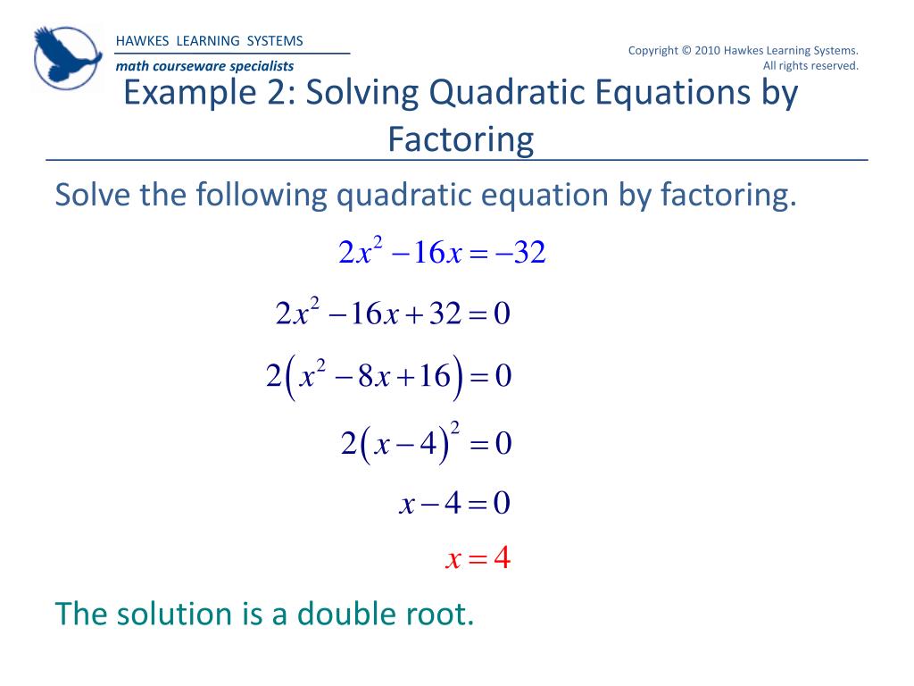 Example 2: Solving Quadratic Equations by Factoring Solve the following quadratic equation by factoring. The solution is a double root.
