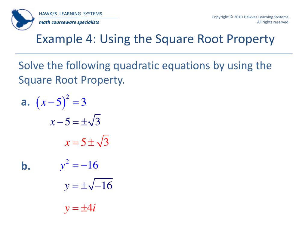 Example 4: Using the Square Root Property Solve the following quadratic equations by using the Square Root Property. a. b.