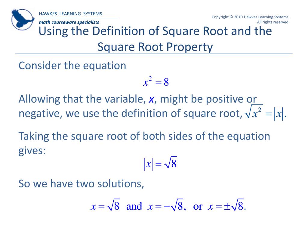 Using the Definition of Square Root and the Square Root Property Consider the equation Allowing that the variable, x, might be positive or negative, we use the definition of square root, Taking the square root of both sides of the equation gives: So we have two solutions,