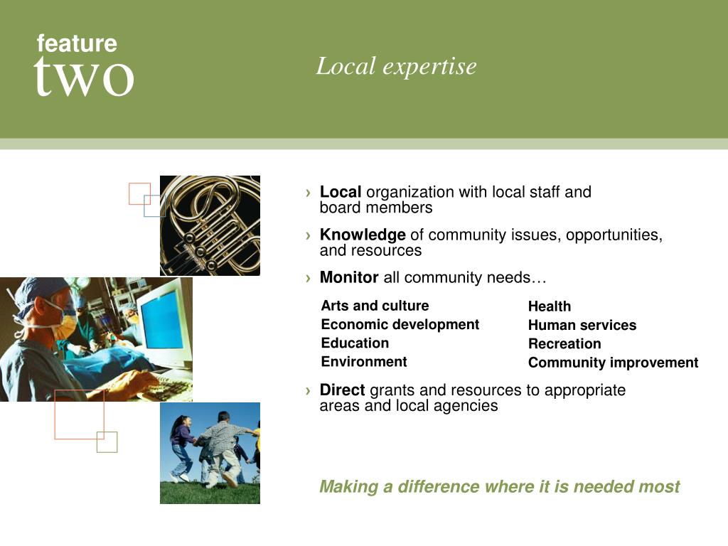 feature two Local expertise ›Local organization with local staff andboard members › Knowledge of community issues, opportunities,and resources ›Monitor all community needs… Arts and culture Economic development Education Environment Health Human services Recreation Community improvement › Direct grants and resources to appropriate areas and local agencies Making a difference where it is needed most