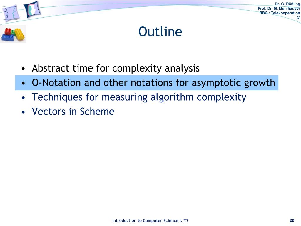 Outline • Abstract time for complexity analysis • O-Notation and other notations for asymptotic growth • Techniques for measuring algorithm complexity • Vectors in Scheme