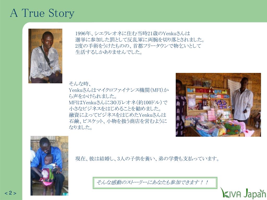 A True Story 1996年、シエラレオネに住む当時21歳のYenkuさんは 選挙に参加した罰として反乱軍に両腕を切り落とされました。 2度の手術をうけたものの、首都フリータウンで物乞いとして生活するしかありませんでした。 そんな時、 Yenkuさんはマイクロファイナンス機関(MFI)から声をかけられました。 MFIはYenkuさんに30万レオネ(約100ドル)で小さなビジネスをはじめることを勧めました。 融資によってビジネスをはじめたYenkuさんは 石鹸、ビスケット、小物を扱う商店を営むようになりました。 現在、彼は結婚し、3人の子供を養い、弟の学費も支払っています。 そんな感動のストーリーにあなたも参加できます!!
