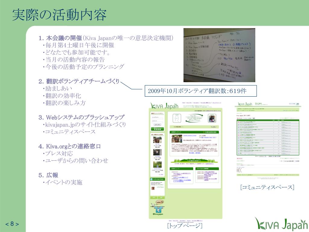 実際の活動内容 1.本会議の開催(Kiva Japanの唯一の意思決定機関) ・毎月第4土曜日午後に開催 ・どなたでも参加可能です。 ・当月の活動内容の報告 ・今後の活動予定のプランニング 2.翻訳ボランティアチームづくり ・励ましあい ・翻訳の効率化 ・翻訳の楽しみ方 3.Webシステムのブラッシュアップ ・kivajapan.jpのサイト仕組みづくり ・コミュニティスペース 4.Kiva.orgとの連絡窓口 ・プレス対応 ・ユーザからの問い合わせ 5.広報 ・イベントの実施 2009年10月ボランティア翻訳数:619件 [コミュニティスペース] [トップページ]