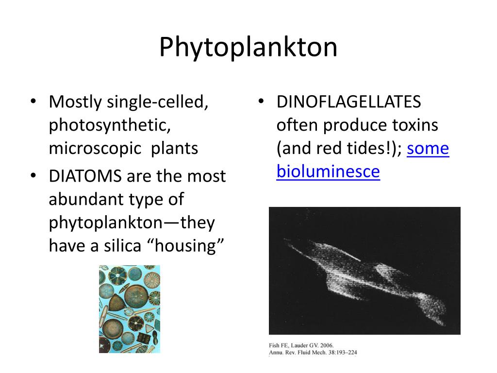 Phytoplankton • Mostly single-celled, photosynthetic, microscopic plants • DIATOMS are the most abundant type of phytoplankton—they have a silica “housing” • DINOFLAGELLATES often produce toxins (and red tides!); some bioluminesce
