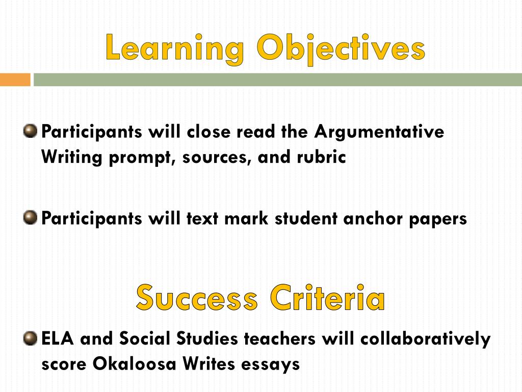 Okaloosa Writes. Learning Objectives. Participants will close read the Argumentative Writing prompt, sources, and rubric Participants will text mark student anchor papers . Success Criteria ELA and Social Studies teachers will collaboratively score Okaloosa Writes essays .