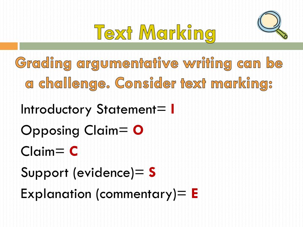 Text Marking • Grading argumentative writing can be a challenge. Consider text marking: • Introductory Statement= I • Opposing Claim=O • Claim=C • Support (evidence)=S • Explanation (commentary)= E