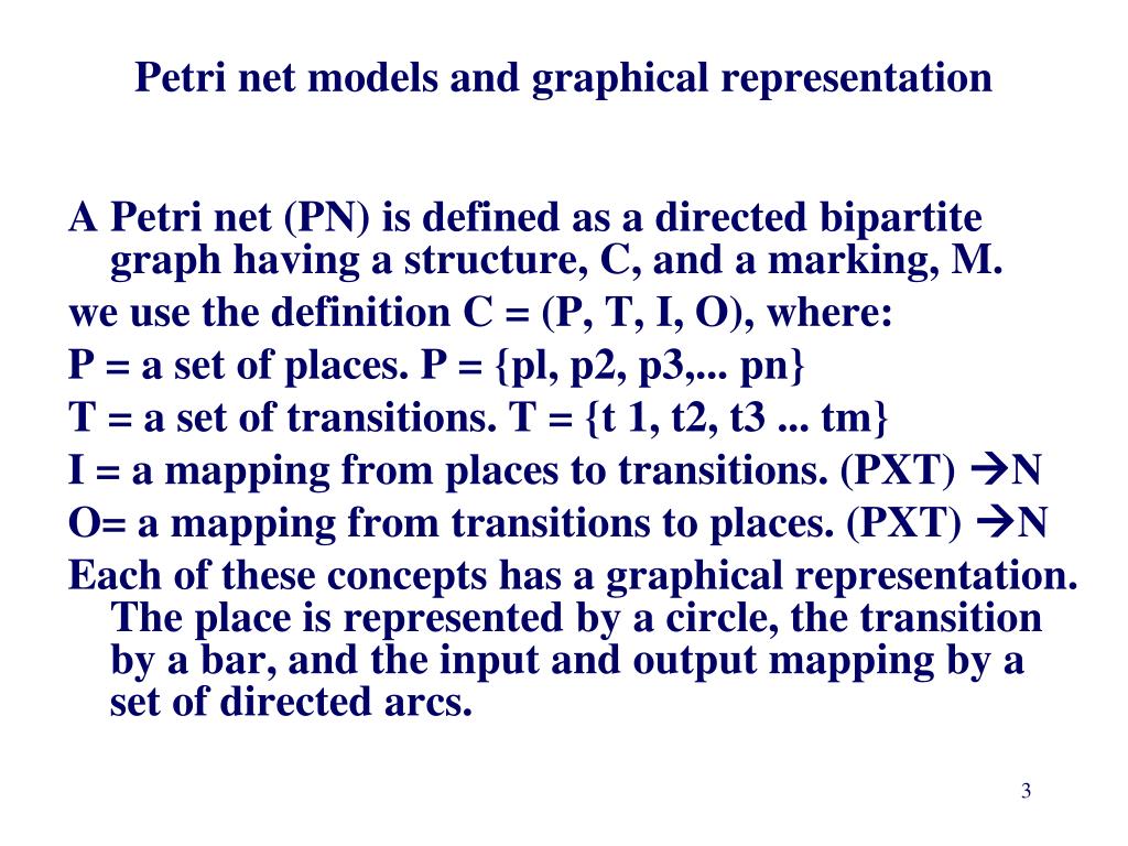 Petri net models and graphical representation A Petri net (PN) is defined as a directed bipartite graph having a structure, C, and a marking, M. we use the definition C = (P, T, I, O), where: P = a set of places. P = {pl, p2, p3,... pn} T = a set of transitions. T = {t 1, t2, t3 ... tm} I = a mapping from places to transitions. (PXT) N O= a mapping from transitions to places. (PXT) N Each of these concepts has a graphical representation. The place is represented by a circle, the transition by a bar, and the input and output mapping by a set of directed arcs.