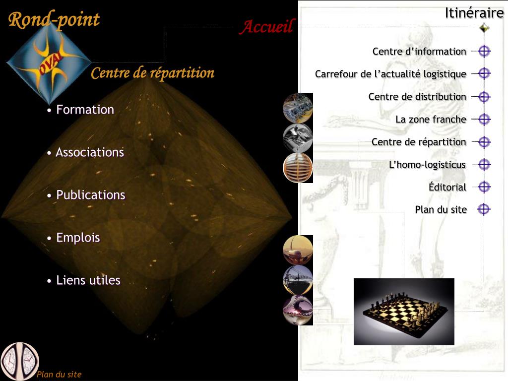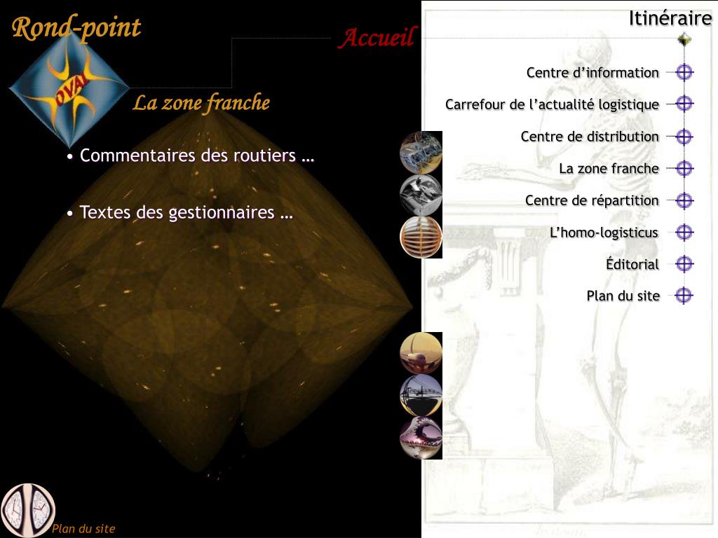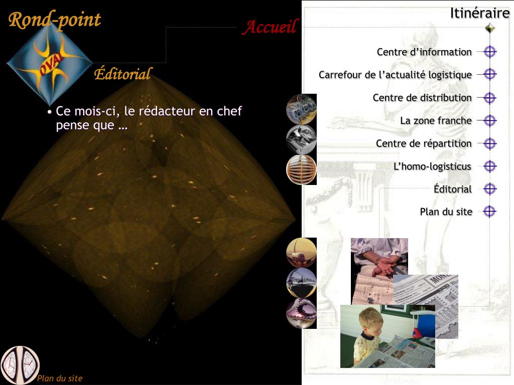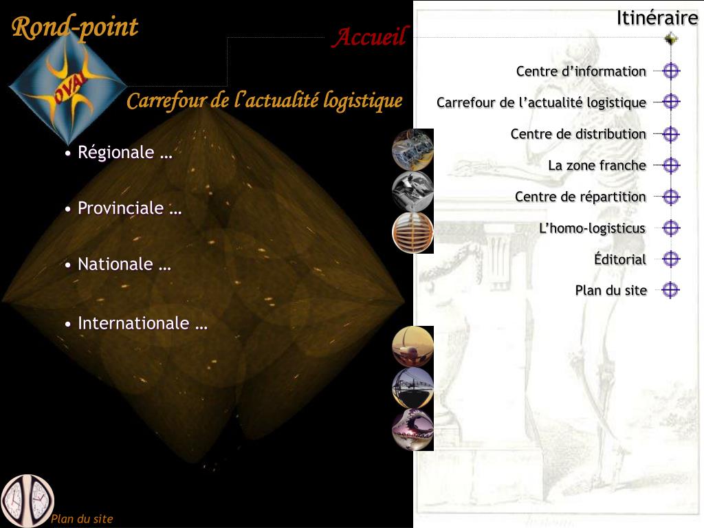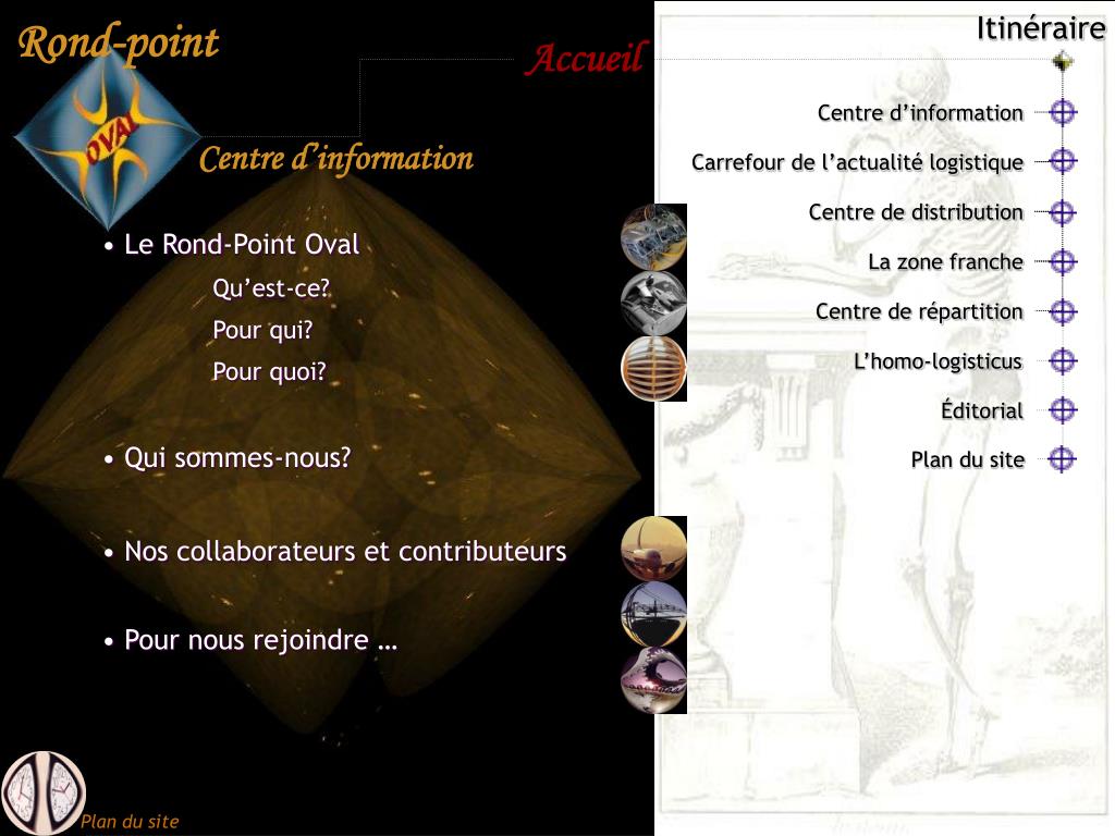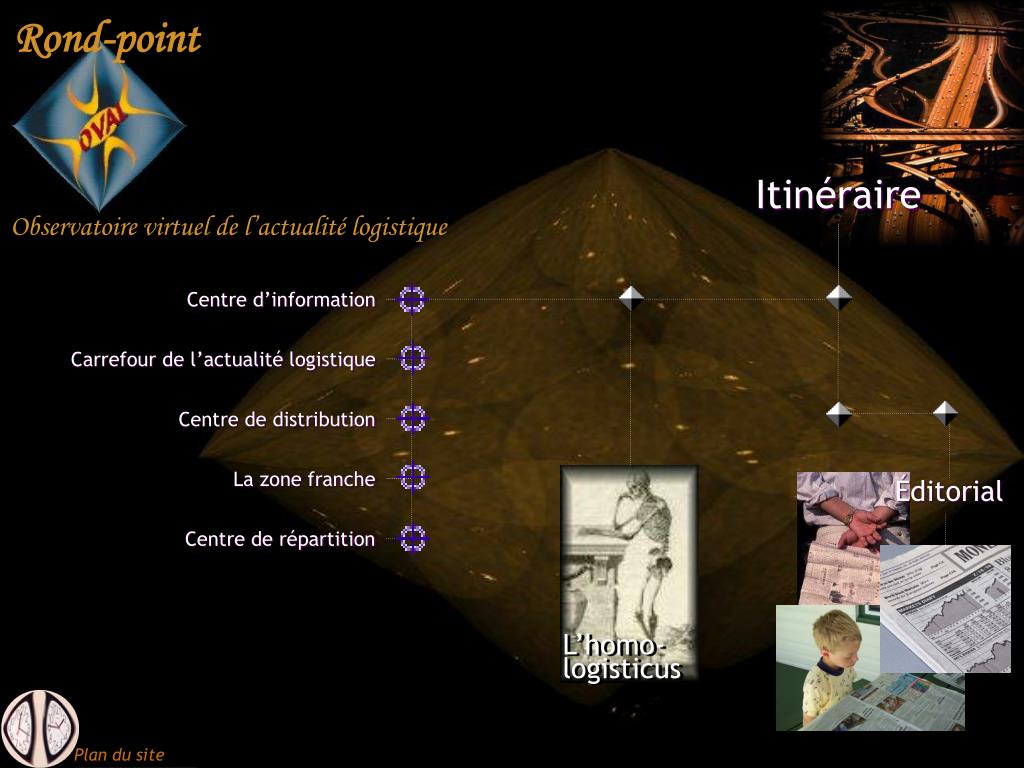 Éditorial. L’homo- logisticus. Plan du site. Itinéraire. Centre d’information. Carrefour de l’actualité logistique. Centre de distribution. La zone franche. Centre de répartition. Centre d’information. Le Rond-Point Oval Qu’est-ce? Pour qui? Pour quoi? Qui sommes-nous?
