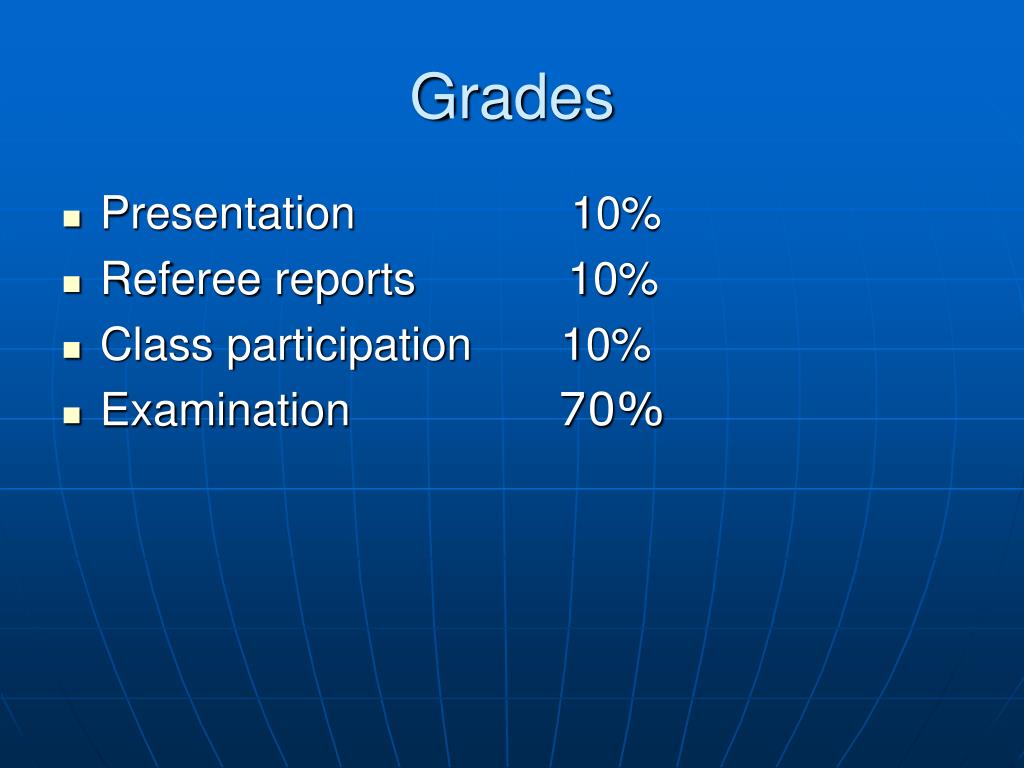Grades • Presentation 10% • Referee reports 10% • Class participation 10% • Examination 70%