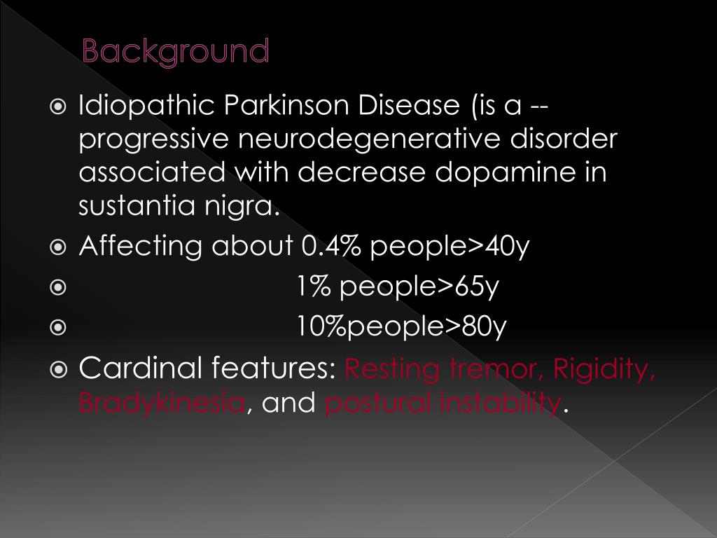 Background • Idiopathic Parkinson Disease (is a --progressive neurodegenerative disorder associated with decrease dopamine in sustantianigra. • Affecting about 0.4% people>40y • 1% people>65y • 10%people>80y • Cardinal features: Resting tremor, Rigidity, Bradykinesia, and postural instability.
