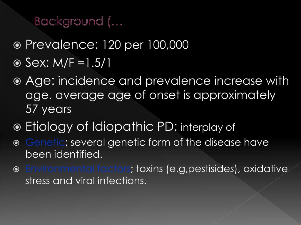 Background (… • Prevalence: 120 per 100,000 • Sex: M/F =1.5/1 • Age: incidence and prevalence increase with age. average age of onset is approximately 57 years • Etiology of Idiopathic PD: interplay of • Genetic; several genetic form of the disease have been identified. • Environmental factors; toxins (e.g,pestisides), oxidative stress and viral infections.