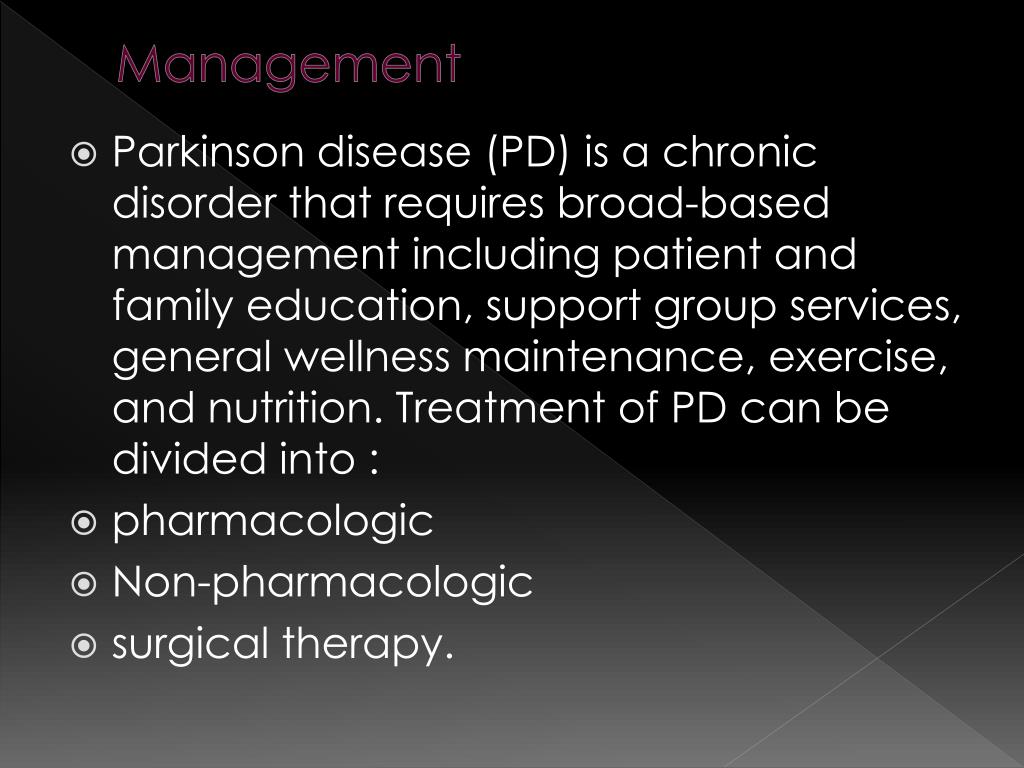 Management • Parkinson disease (PD) is a chronic disorder that requires broad-based management including patient and family education, support group services, general wellness maintenance, exercise, and nutrition. Treatment of PD can be divided into : • pharmacologic • Non-pharmacologic • surgical therapy.