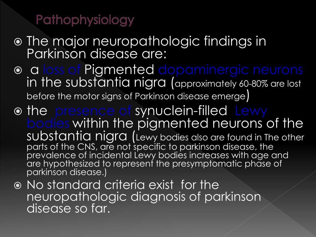 Pathophysiology • The major neuropathologic findings in Parkinson disease are: • a loss of Pigmented dopaminergic neurons in the substantia nigra (approximately 60-80% are lost before the motor signs of Parkinson disease emerge) • the presence of synuclein-filled Lewy bodieswithin the pigmented neurons of the substantia nigra (Lewy bodies also are found in The other parts of the CNS, are not specific to parkinson disease, the prevalence of incidental Lewy bodies increases with age and are hypothesized to represent the presymptomatic phase of parkinson disease.) • No standard criteria exist for the neuropathologic diagnosis of parkinson disease so far.
