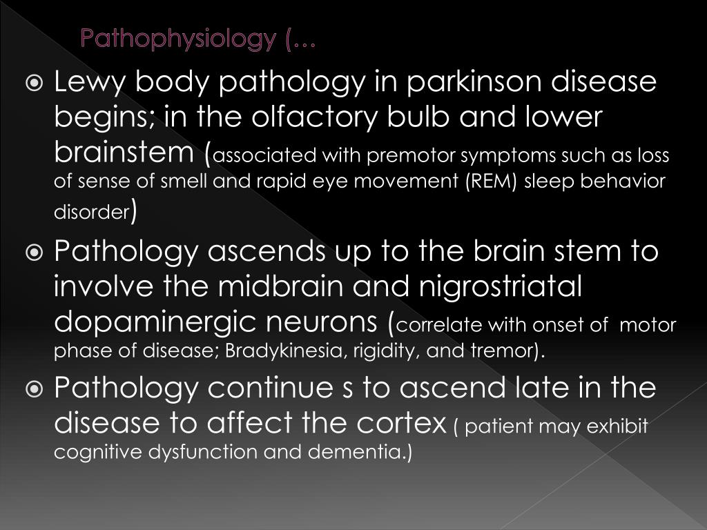 Pathophysiology (… • Lewy body pathology in parkinson disease begins; in the olfactory bulb and lower brainstem (associated with premotor symptoms such as loss of sense of smell and rapid eye movement (REM) sleep behavior disorder) • Pathology ascends up to the brain stem to involve the midbrain and nigrostriatal dopaminergic neurons (correlate with onset of motor phase of disease; Bradykinesia, rigidity, and tremor). • Pathology continue s to ascend late in the disease to affect the cortex ( patient may exhibit cognitive dysfunction and dementia.)