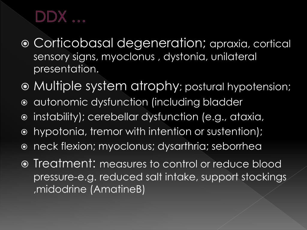 DDX … • Corticobasal degeneration; apraxia, cortical sensory signs, myoclonus , dystonia, unilateral presentation. • Multiple system atrophy; postural hypotension; • autonomic dysfunction (including bladder • instability); cerebellar dysfunction (e.g., ataxia, • hypotonia, tremor with intention or sustention); • neck flexion; myoclonus; dysarthria; seborrhea • Treatment: measures to control or reduce blood pressure-e.g. reduced salt intake, support stockings ,midodrine (AmatineB)