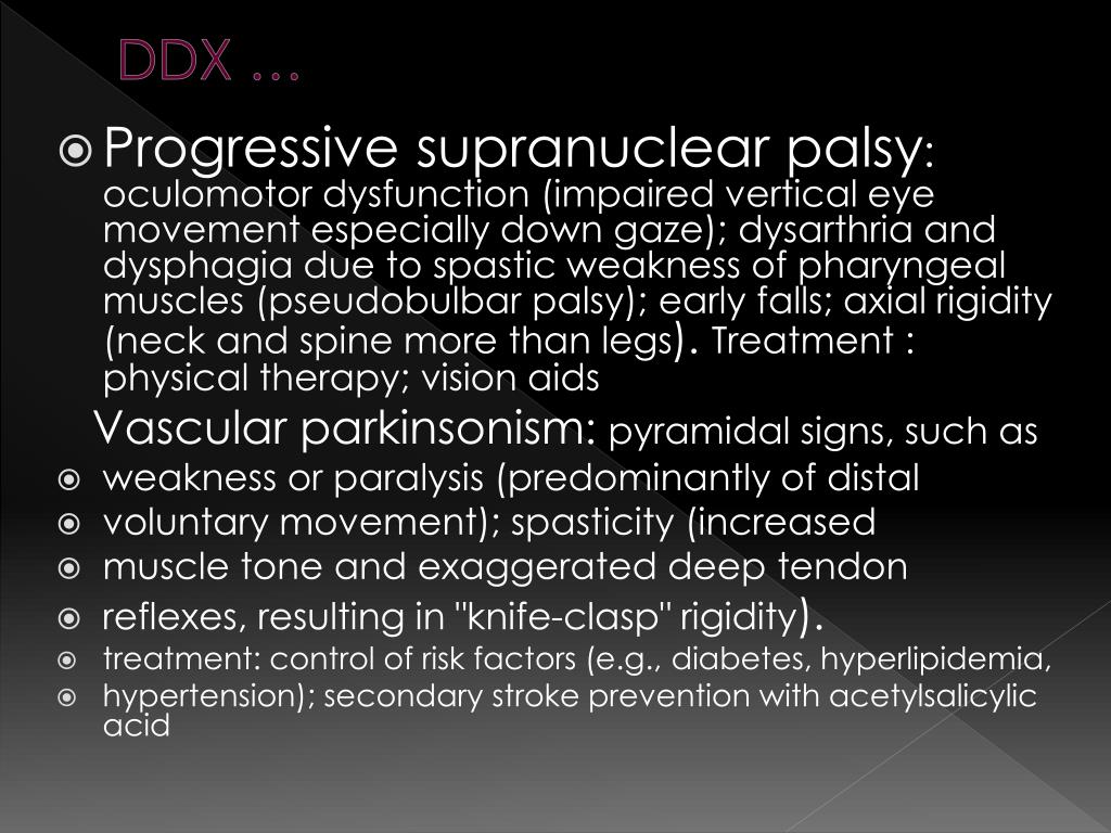 DDX … • Progressive supranuclear palsy: oculomotor dysfunction (impaired vertical eye movement especially down gaze); dysarthria and dysphagia due to spastic weakness of pharyngeal muscles (pseudobulbar palsy); early falls; axial rigidity (neck and spine more than legs). Treatment : physical therapy; vision aids Vascular parkinsonism: pyramidal signs, such as • weakness or paralysis (predominantly of distal • voluntary movement); spasticity (increased • muscle tone and exaggerated deep tendon • reflexes, resulting in "knife-clasp" rigidity). • treatment: control of risk factors (e.g., diabetes, hyperlipidemia, • hypertension); secondary stroke prevention with acetylsalicylic acid