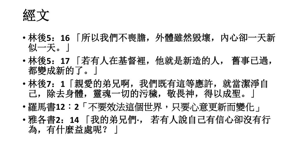 經文 • 林後5:16 「所以我們不喪膽,外體雖然毀壞,內心卻一天新似一天。」 • 林後5:17 「若有人在基督裡,他就是新造的人, 舊事已過,都變成新的了。」 • 林後7:1「親愛的弟兄啊,我們既有這等應許,就當潔淨自己,除去身體,靈魂一切的污穢,敬畏神,得以成聖。」 • 羅馬書12:2「不要效法這個世界,只要心意更新而變化」 • 雅各書2:14 「我的弟兄們·, 若有人說自己有信心卻沒有行為,有什麼益處呢? 」