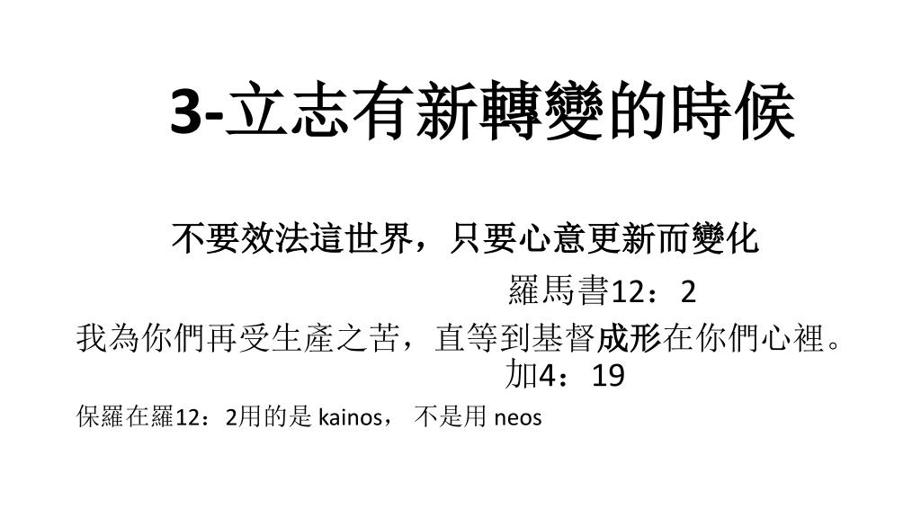 3-立志有新轉變的時候 不要效法這世界,只要心意更新而變化 羅馬書12:2 我為你們再受生產之苦,直等到基督成形在你們心裡。 加4:19 保羅在羅12:2用的是kainos, 不是用 neos