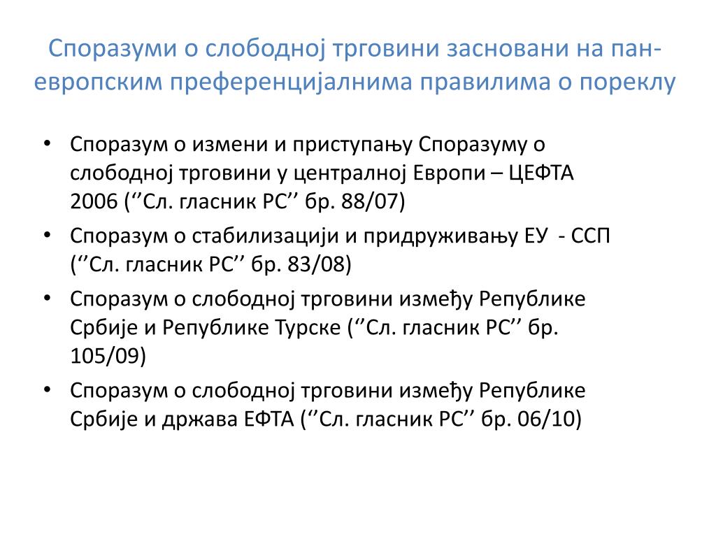 Споразуми о слободној трговини засновани на пан-европским преференцијалнима правилима о пореклу • Споразум о измени и приступању Споразуму о слободној трговини у централној Европи – ЦЕФТА 2006 (‘’Сл. гласник РС’’ бр. 88/07) • Споразум о стабилизацији и придруживању ЕУ - ССП (‘’Сл. гласник РС’’ бр. 83/08) • Споразум о слободној трговини између Републике Србије и Републике Турске (‘’Сл. гласник РС’’ бр. 105/09) • Споразум о слободној трговини између Републике Србије и држава ЕФТА (‘’Сл. гласник РС’’ бр. 06/10)