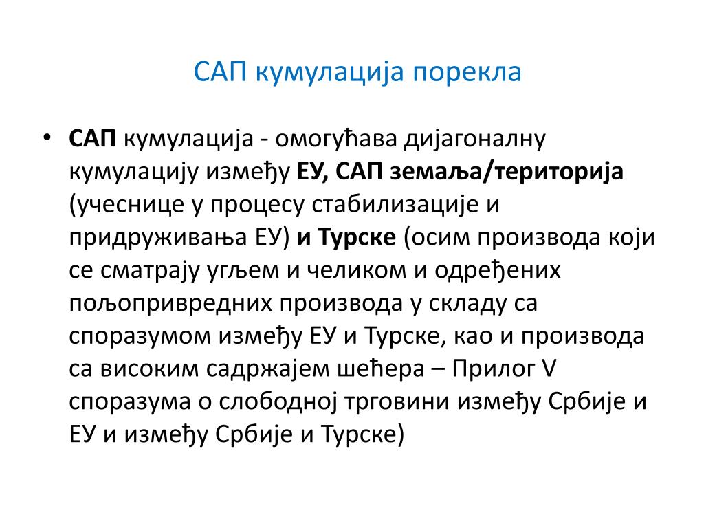 САП кумулација порекла • САП кумулација - омогућава дијагоналну кумулацију између ЕУ,САП земаља/територија (учеснице у процесу стабилизације и придруживања ЕУ) и Турскe (осим производа који се сматрају угљем и челиком и одређених пољопривредних производа у складу са споразумом између ЕУ и Турске, као и производа са високим садржајем шећера – Прилог V споразума о слободној трговини између Србије и ЕУ и између Србије и Турске)