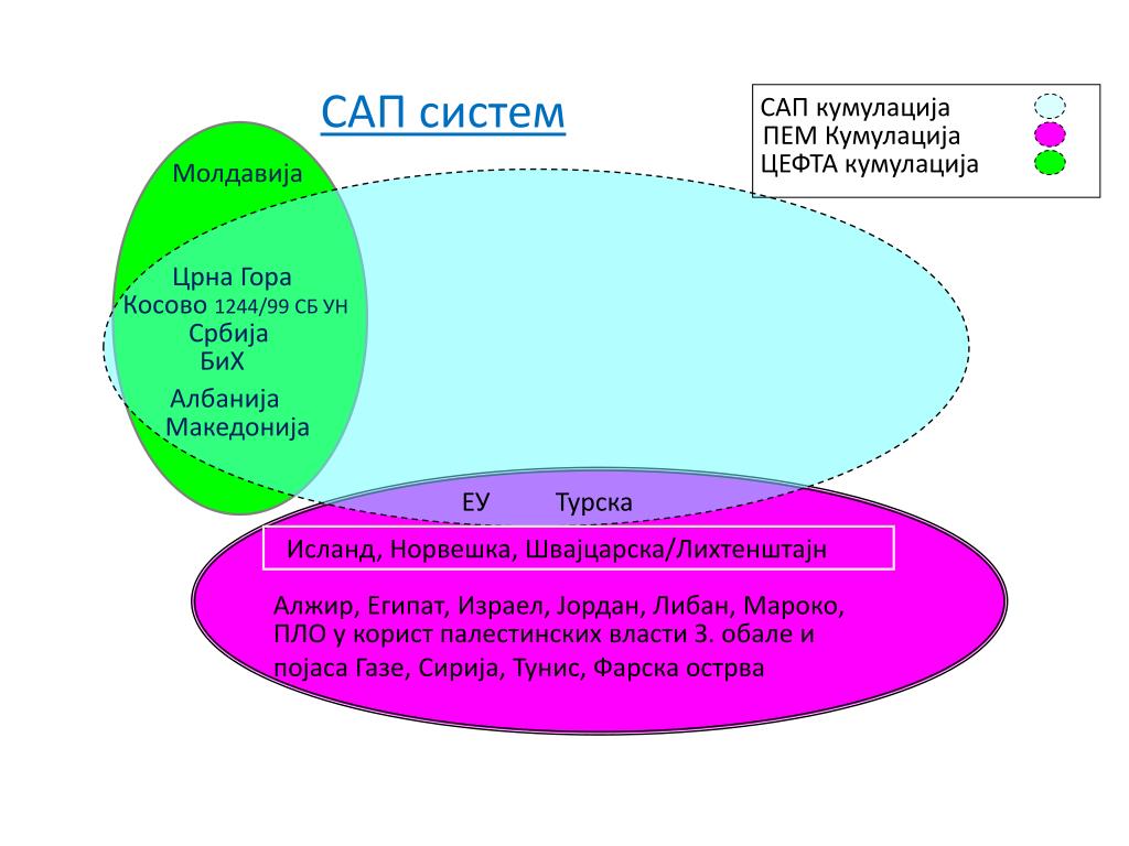 САП систем САП кумулација ПЕМ Кумулација ЦЕФТА кумулација Молдавија ЦрнаГора Косово1244/99 СБ УН Србија БиХ Албанија Македонија ЕУ Турска Исланд, Норвешка,Швајцарска/Лихтенштајн Алжир, Египат, Израел, Јордан, Либан, Мароко, ПЛО у користпалестинскихвласти З. обале и појасаГазе, Сирија, Тунис, Фарскаострва