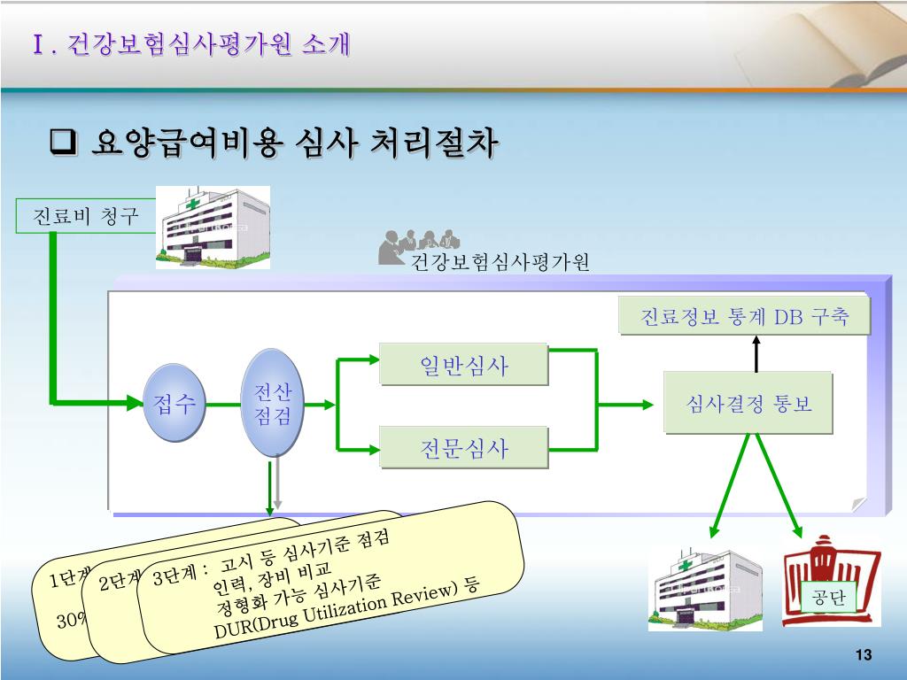 Ⅰ. 건강보험심사평가원 소개 5 . 요양급여대상 여부 확인업무 • 개요 • - 국민들이 의료기관에 지불한 비용이 요양급여기준에 맞게 책정 • 되었는지의 여부를 확인하는 업무 (국민이 직접 신청한 경우 해당) • - 국민의 권익보호를 위하여 (건강보험법 제43조의 2, 의료급여법 • 제11조의3)) • 확인결과의 적용 • 과다징수금액이 있으면 요양기관은 환자에게 환불하여야 하며, • 환불하지 않을 경우 공단이 요양기관에 지급할 금액에서 공제하여 • 지급 • 2009.3.1일 접수분부터 심평원으로 일원화