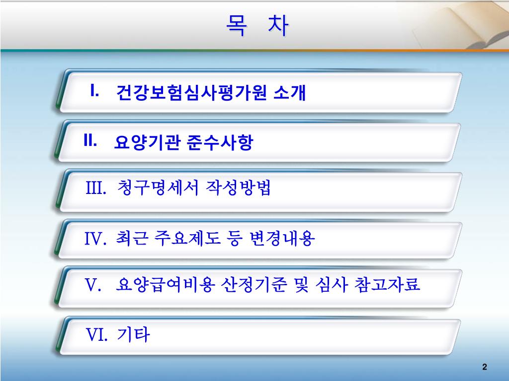 신규개설 요양기관 설명회. 2010. 2.17. 건강보험심사평가원 대구지원. 목 차. 건강보험심사평가원 소개. 요양기관 준수사항. 청구명세서 작성방법. 요양급여비용 산정기준 및 심사 참고자료. 기타. 최근 주요제도 등 변경내용. 목 차. 건강보험심사평가원 기능 및 업무. 내과 심사사례. 요양급여비용 산정기준 및 심사 참고자료. 기타. 건강보험심사평가원 소개. 최근 주요제도 등 변경내용. Ⅰ . 건강보험심사평가원 소개. 1. 법적 성격.