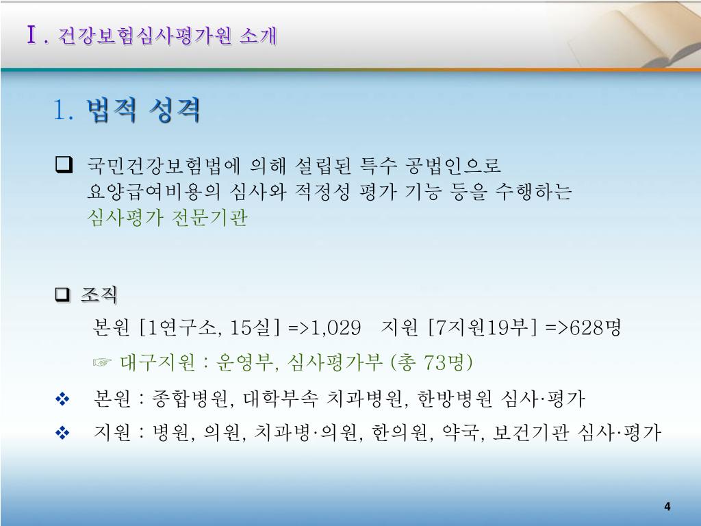 Ⅰ. 건강보험심사평가원 소개 1. 법적 성격 • 국민건강보험법에 의해 설립된 특수 공법인으로 • 요양급여비용의 심사와 적정성 평가 기능 등을 수행하는 • 심사평가 전문기관 • 조직 본원 [1연구소, 15실] =>1,029지원 [7지원19부] =>628명 • ☞ 대구지원 : 운영부, 심사평가부 (총 73명) • 본원 : 종합병원, 대학부속 치과병원, 한방병원 심사·평가 • 지원 : 병원, 의원, 치과병·의원, 한의원, 약국, 보건기관 심사·평가