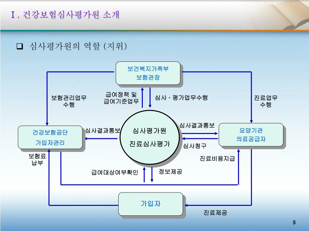 보건복지가족부 보험관장 급여정책 및 급여기준업무 보험관리업무 수행 심사 평가업무수행 진료업무 수행 심사평가원 진료심사평가 심사결과통보 요양기관 의료공급자 건강보험공단 가입자관리 심사결과통보 심사청구 보험료 납부 진료비용지급 정보제공 급여대상여부확인 가입자 진료제공 Ⅰ. 건강보험심사평가원 소개 • 심사평가원의 역할 (지위)