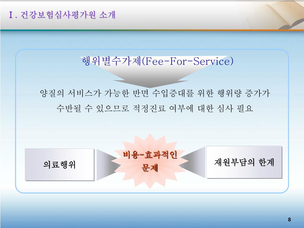 행위별수가제(Fee-For-Service) 양질의 서비스가 가능한 반면 수입증대를 위한 행위량 증가가 수반될 수 있으므로 적정진료 여부에 대한 심사 필요 비용-효과적인 문제 재원부담의 한계 의료행위 Ⅰ. 건강보험심사평가원 소개