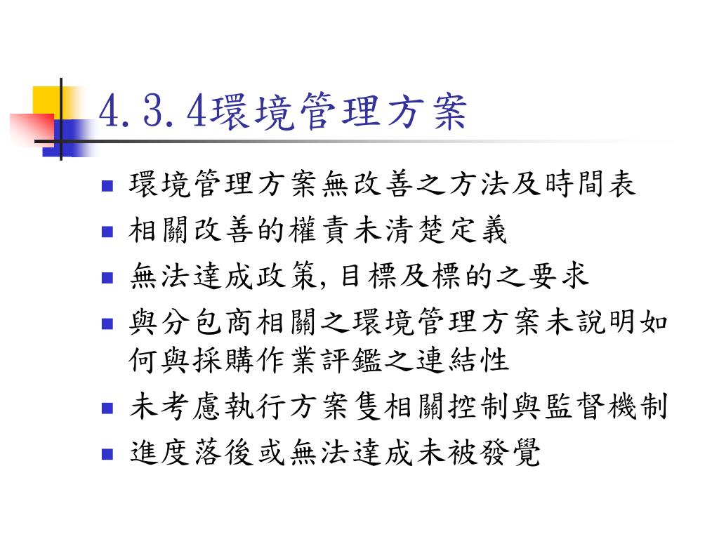 4.3.4環境管理方案 • 環境管理方案無改善之方法及時間表 • 相關改善的權責未清楚定義 • 無法達成政策,目標及標的之要求 • 與分包商相關之環境管理方案未說明如何與採購作業評鑑之連結性 • 未考慮執行方案隻相關控制與監督機制 • 進度落後或無法達成未被發覺