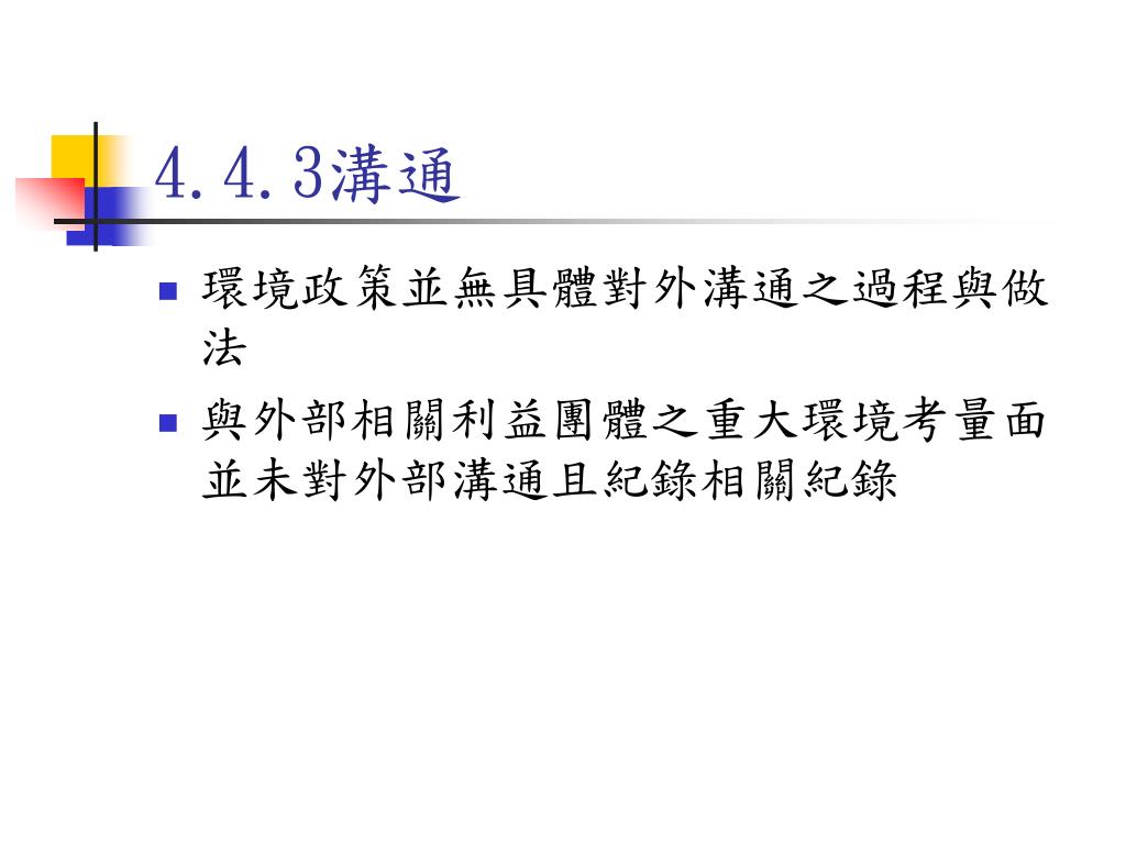 4.4.3溝通 • 環境政策並無具體對外溝通之過程與做法 • 與外部相關利益團體之重大環境考量面並未對外部溝通且紀錄相關紀錄