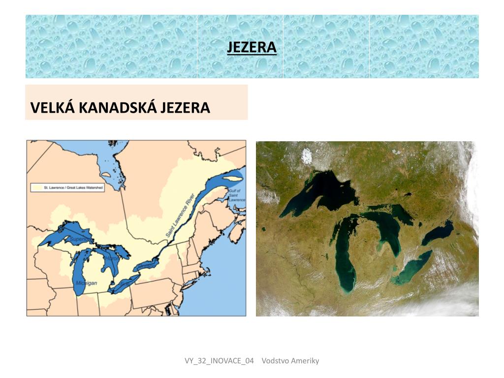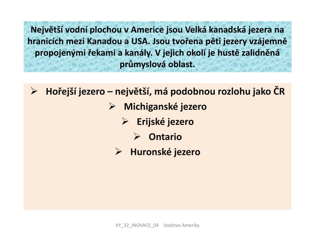 Největší vodní plochou v Americe jsou Velká kanadská jezera na hranicích mezi Kanadou a USA. Jsou tvořena pěti jezery vzájemně propojenými řekami a kanály. V jejich okolí je hustě zalidněná průmyslová oblast. Hořejší jezero – největší, má podobnou rozlohu jako ČR Michiganské jezero Erijské jezero Ontario Huronské jezero VY_32_INOVACE_04 Vodstvo Ameriky