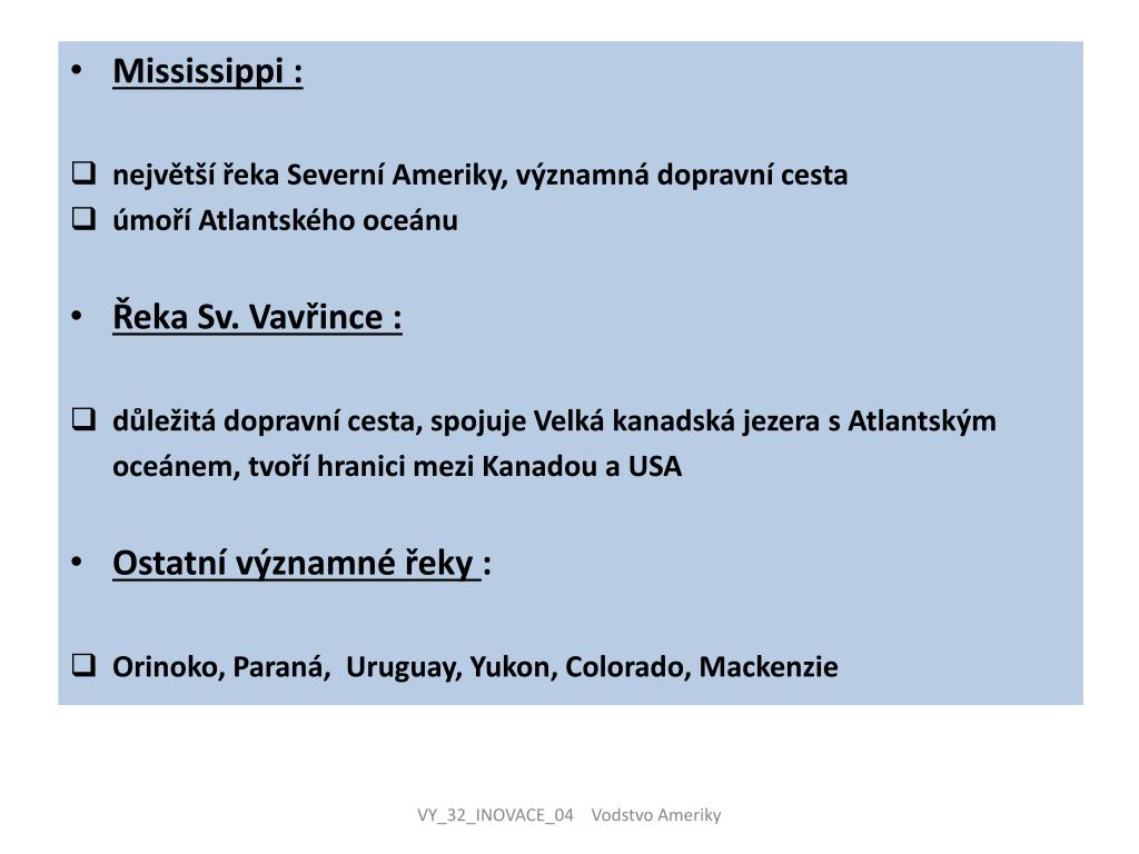 Mississippi : • největší řeka Severní Ameriky, významná dopravní cesta • úmoří Atlantského oceánu • Řeka Sv. Vavřince : • důležitá dopravní cesta, spojuje Velká kanadská jezera s Atlantským oceánem, tvoří hranici mezi Kanadou a USA • Ostatní významné řeky : • Orinoko, Paraná, Uruguay, Yukon, Colorado, Mackenzie VY_32_INOVACE_04 Vodstvo Ameriky