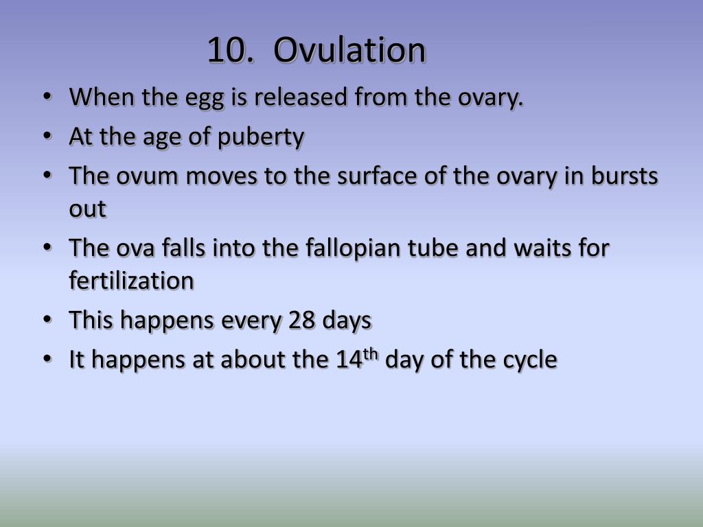 10. Ovulation When the egg is released from the ovary. At the age of puberty The ovum moves to the surface of the ovary in bursts out The ova falls into the fallopian tube and waits for fertilization This happens every 28 days It happens at about the 14th day of the cycle
