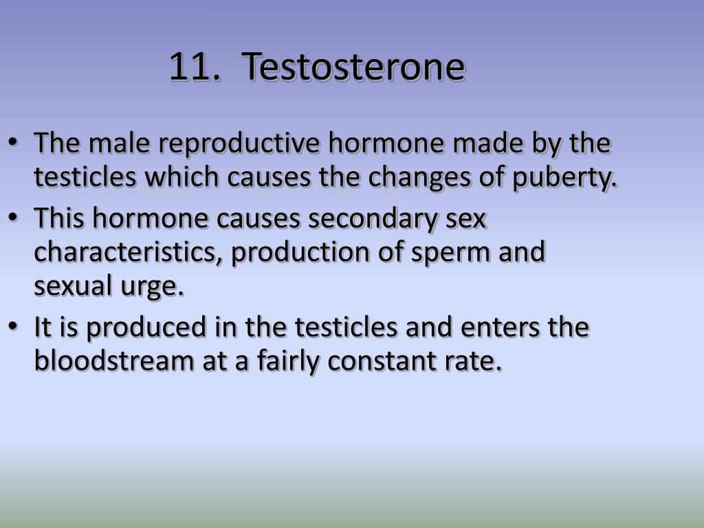 11. Testosterone The male reproductive hormone made by the testicles which causes the changes of puberty. This hormone causes secondary sex characteristics, production of sperm and sexual urge. It is produced in the testicles and enters the bloodstream at a fairly constant rate.