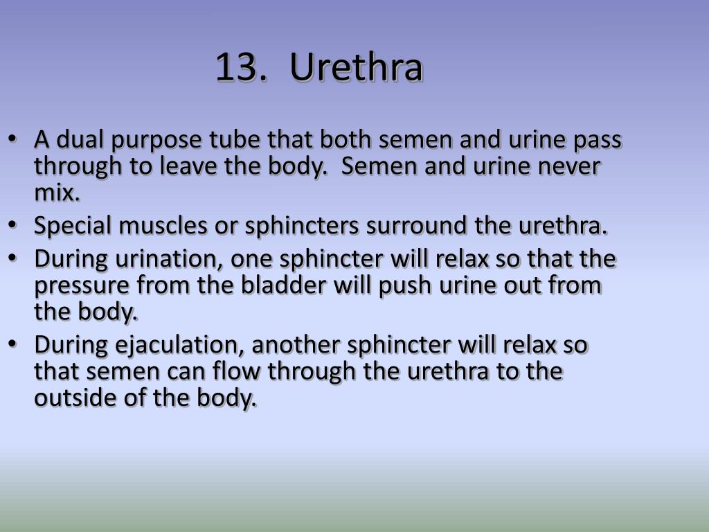 13. Urethra A dual purpose tube that both semen and urine pass through to leave the body. Semen and urine never mix. Special muscles or sphincters surround the urethra. During urination, one sphincter will relax so that the pressure from the bladder will push urine out from the body. During ejaculation, another sphincter will relax so that semen can flow through the urethra to the outside of the body.