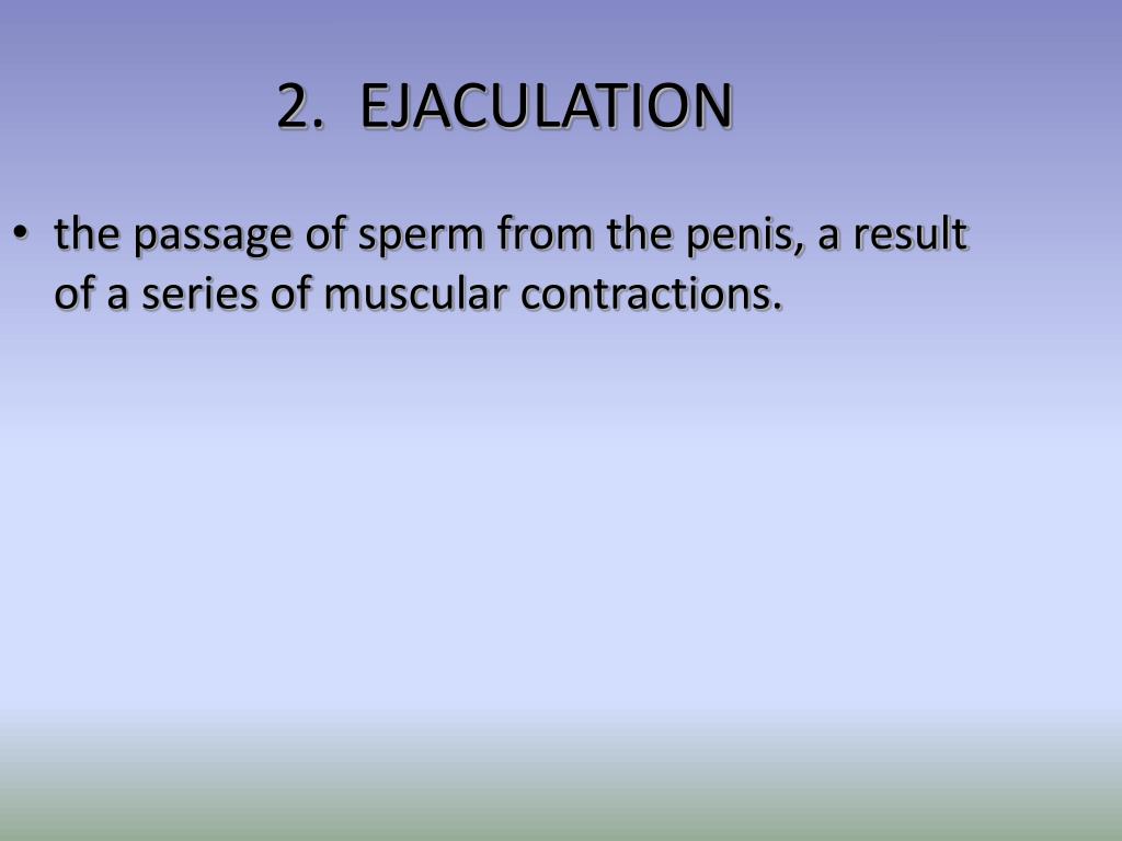 2. EJACULATION the passage of sperm from the penis, a result of a series of muscular contractions.