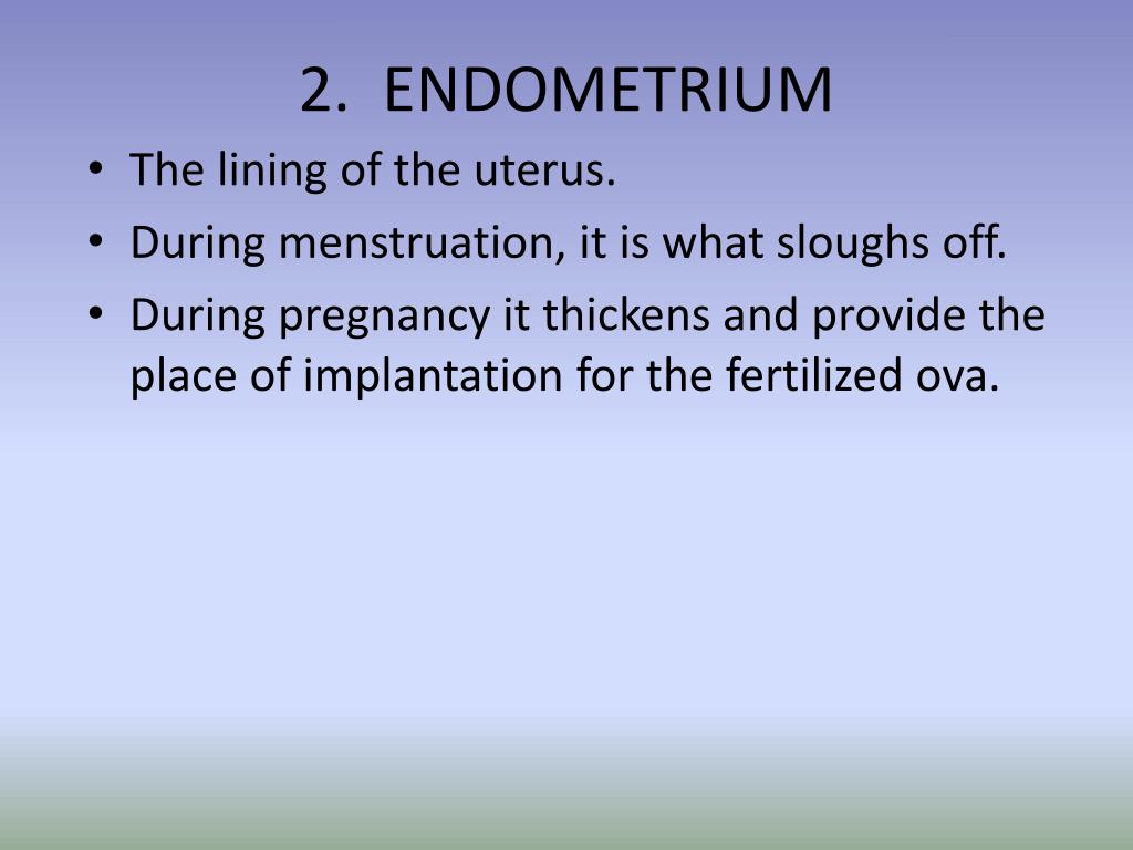 2. ENDOMETRIUM • The lining of the uterus. • During menstruation, it is what sloughs off. • During pregnancy it thickens and provide the place of implantation for the fertilized ova.