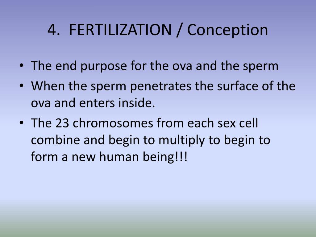 4. FERTILIZATION / Conception • The end purpose for the ova and the sperm • When the sperm penetrates the surface of the ova and enters inside. • The 23 chromosomes from each sex cell combine and begin to multiply to begin to form a new human being!!!