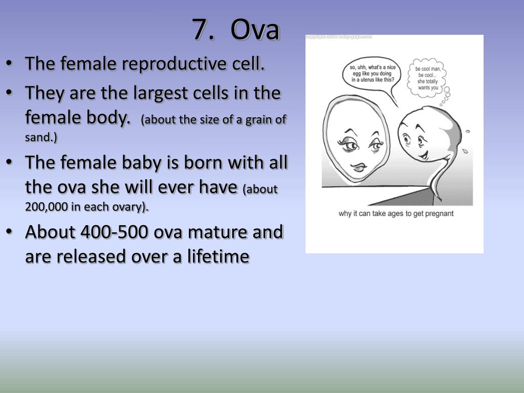 7. Ova The female reproductive cell. They are the largest cells in the female body. (about the size of a grain of sand.) The female baby is born with all the ova she will ever have (about 200,000 in each ovary). About 400-500 ova mature and are released over a lifetime