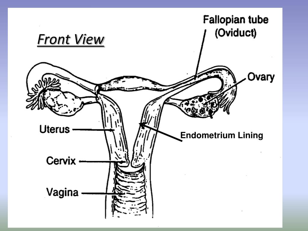 5. Menstrual Cycle and 6. Day 1 – Menstruation begins (process of passing blood and tissue) Day 1-5 – Bleeding Continues Day 6-9 - Ovum is maturing and endometrium lining is thin Day 10 – 14 - Endometrium lining thickens and hormones rise. Around Day 14 – Ovum bursts out of the ovary Day 15-28 – Egg travels down to thickened lining and either is implanted or it dissolves Day 26 – In the absence of fertilization, hormone levels drop and the endometrium lining breaks down Day 28 – Menstruation prepares to begin again.