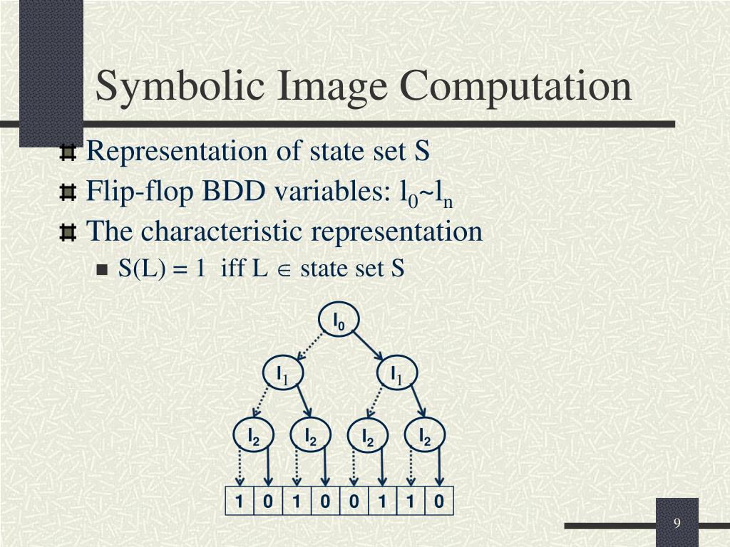 Symbolic Image Computation • Representation of state set S • Flip-flop BDD variables: l0~ln • The characteristic representation • S(L) = 1 iff L state set S l0 l1 l1 l2 l2 l2 l2 1 0 1 0 0 1 1 0