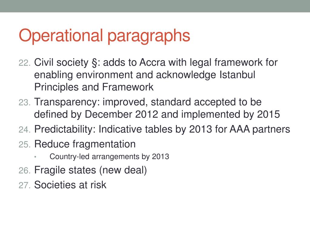 Operational paragraphs • Civil society §: adds to Accra with legal framework for enabling environment and acknowledge Istanbul Principles and Framework • Transparency: improved, standard accepted to be defined by December 2012 and implemented by 2015 • Predictability: Indicative tables by 2013 for AAA partners • Reduce fragmentation • Country-led arrangements by 2013 • Fragile states (new deal) • Societies at risk