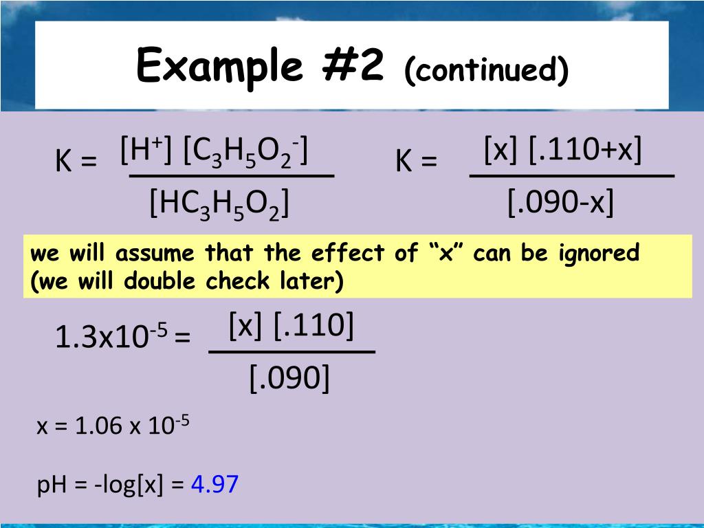 [H+] [C3H5O2-] K = [HC3H5O2] [x] [.100+x] K = [.100-x] Example #1 (continued) we will assume that the effect of “x” can be ignored (we will double check later) K = [x] = 1.3 x 10-5 pH = -log[x] = 4.88