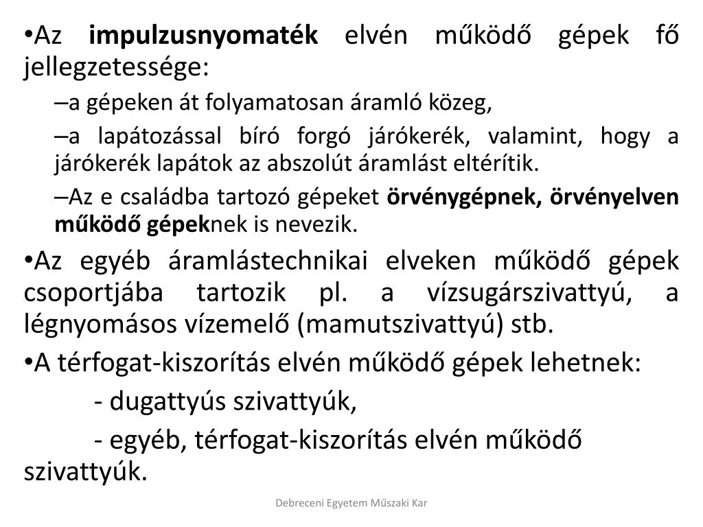 Az impulzusnyomaték elvén működő gépek fő jellegzetessége: • a gépeken át folyamatosan áramló közeg, • a lapátozással bíró forgó járókerék, valamint, hogy a járókerék lapátok az abszolút áramlást eltérítik. • Az e családba tartozó gépeket örvénygépnek, örvényelven működő gépeknek is nevezik. • Az egyéb áramlástechnikai elveken működő gépek csoportjába tartozik pl. a vízsugárszivattyú, a légnyomásos vízemelő (mamutszivattyú) stb. • A térfogat-kiszorítás elvén működő gépek lehetnek: - dugattyús szivattyúk, - egyéb, térfogat-kiszorítás elvén működő szivattyúk. Debreceni Egyetem Műszaki Kar