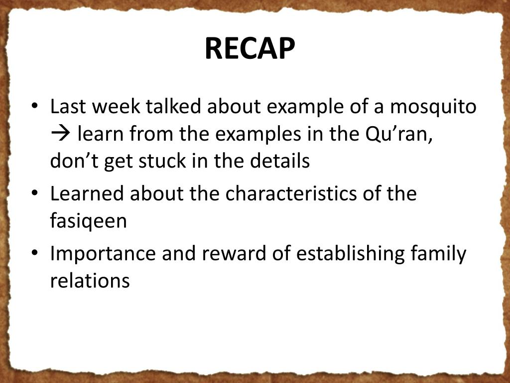 RECAP • Last week talked about example of a mosquito learn from the examples in the Qu’ran, don’t get stuck in the details • Learned about the characteristics of the fasiqeen • Importance and reward of establishing family relations