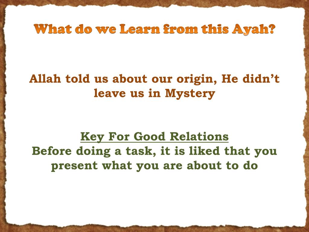 What do we Learn from this Ayah? Allah told us about our origin, He didn’t leave us in Mystery Key For Good Relations Before doing a task, it is liked that you present what you are about to do